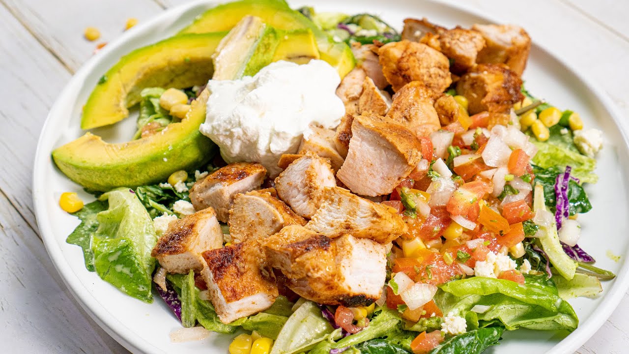 - The salad also includes mixed greens, tomatoes, red onion, as well as cilantro